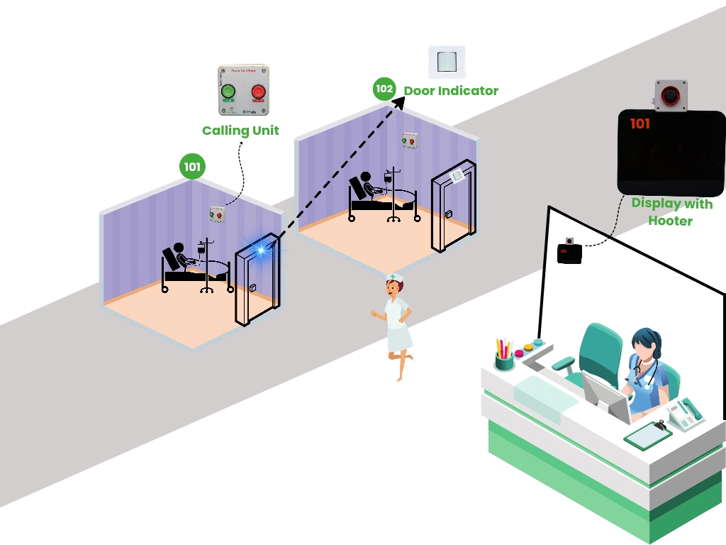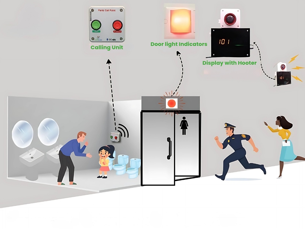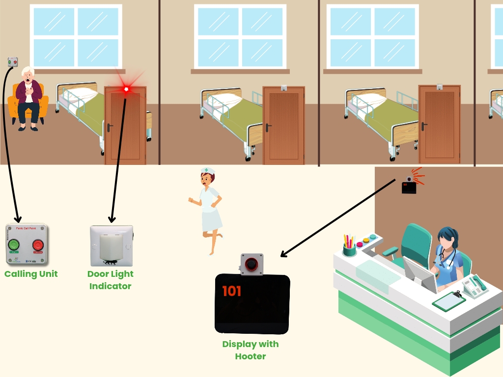 The Caring Bells Panic System is a reliable emergency alert solution designed for instant communication in hospitals, schools, offices, shops, and public spaces. With one-press activation, it immediately notifies caregivers and security staff via door indicators, display units, and audible hooters—ensuring help arrives fast when seconds count.